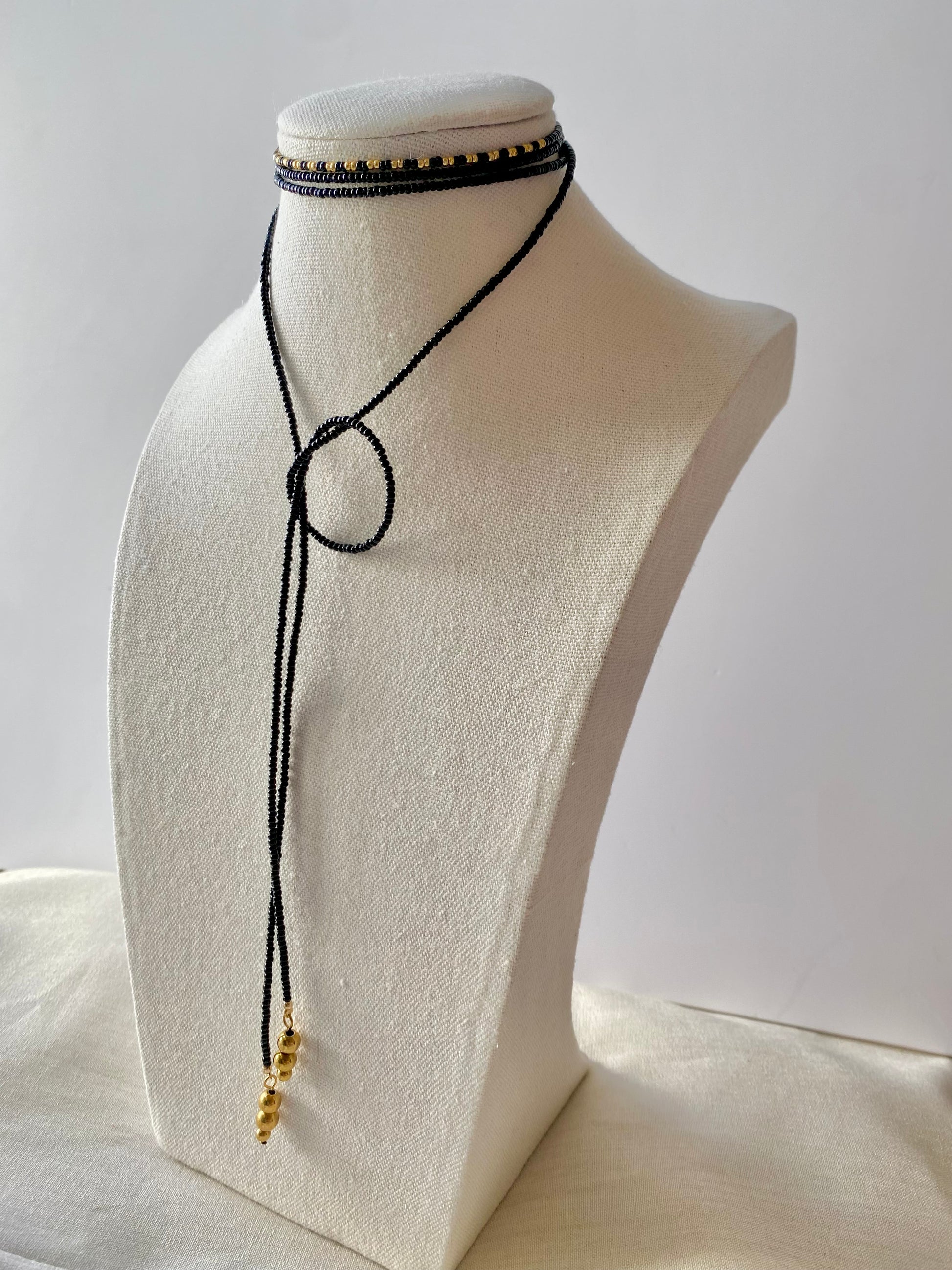 - Bordado a mano con Chaquira miyuki negra y dorada + Hematita dorada.